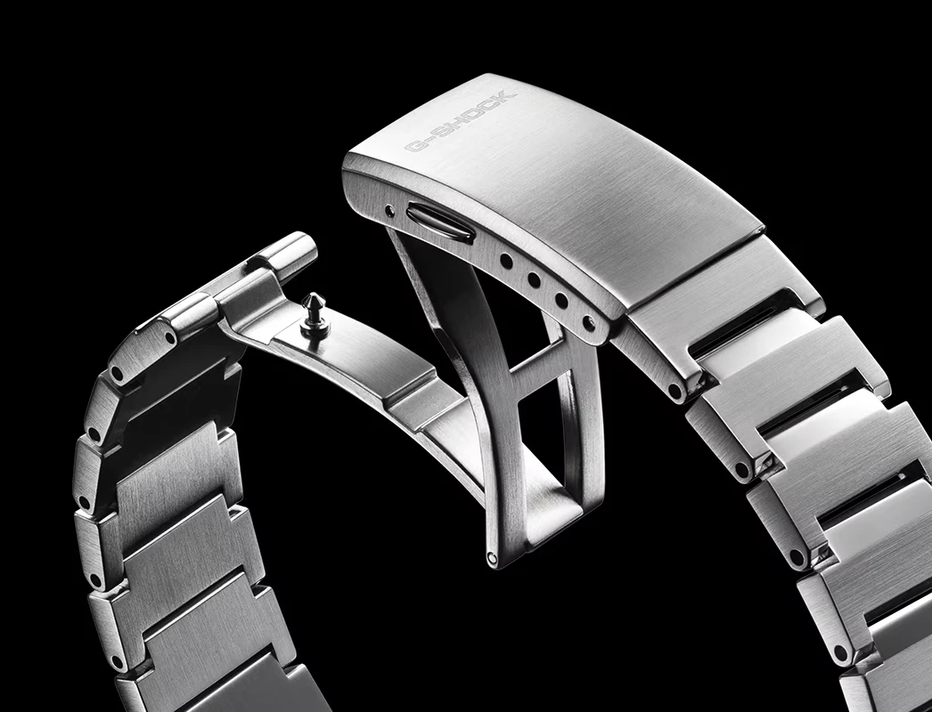 Länken i massivt rostfritt stål har en kombination av borstade och polerade ytor som skapar en levande metallstruktur som förändras med ljuset. Det ger klockan en ren, modern känsla som fungerar lika bra till skjorta som till T‑shirt. Den tunna och lätta konstruktionen gör den skön att bära hela dagen, samtidigt som den tål hårdare användning tack vare G‑SHOCKs välkända stötskydd och Carbon Core Guard‑konstruktion.