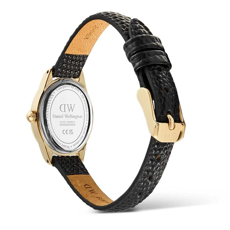 Det svarta läderbandet introducerar en ny tolkning av ödlestruktur, präglat i kromfritt äkta läder för att skapa en fin, taktil yta utan exotiska material. Bandet smalnar av för en bekväm passform och hålls på plats med ett polerat spänne. Kombinationen av svart band och guldfärgad urtavla gör klockan mångsidig och lätt att bära både till vardag och vid mer uppklädda tillfällen. Ett japanskt kvartsurverk säkerställer pålitlig precision och gör modellen till ett självklart val för kvinnor som uppskattar stilrena damklockor med genomtänkta detaljer.