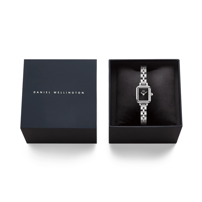 Boetten mäter 15,4 × 18,2 mm och ger ett nätt och sofistikerat intryck. Armbandet är 6 mm brett och fästs med spring bars för enkel hantering. Klockan är tillverkad i 316L rostfritt stål, både boett och armband, och har en polerad finish som ger en elegant lyster. Urtavlan är svart och skyddas av mineralglas. Den justerbara längden sträcker sig från 125 till 180 mm, vilket gör att klockan sitter bekvämt på de flesta handleder. Drivs av ett japanskt kvartsurverk och har utbytbara armband för flexibel styling.