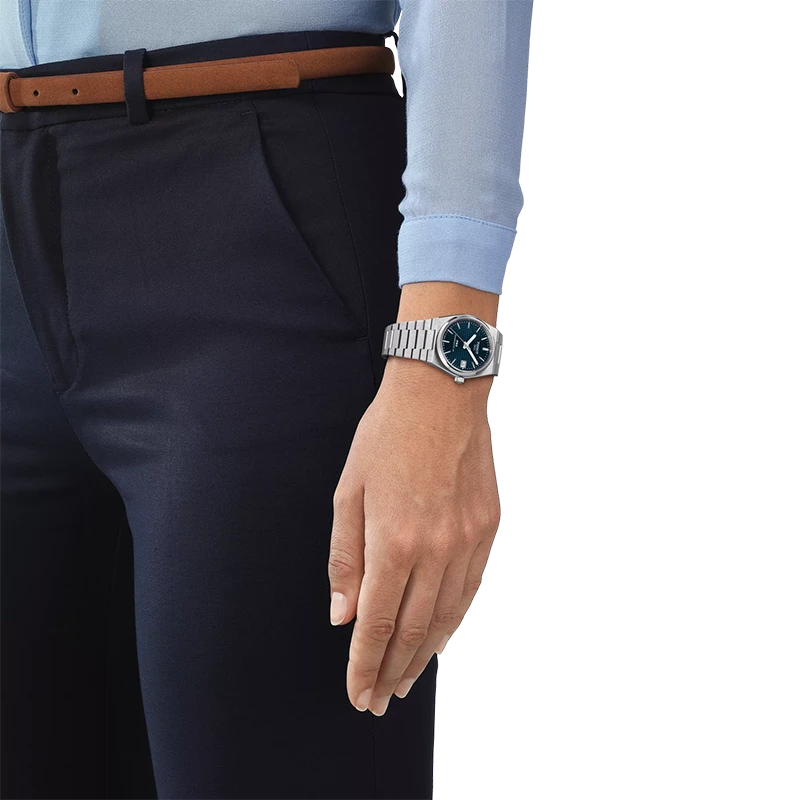 Den slimmade tonneauformade boetten och det integrerade stålarmbandet skapar PRX-modellens karaktäristiska silhuett. Den blå urtavlan med det distinkta ”waffle”-mönstret ger djup och struktur, samtidigt som den fångar ljuset på ett levande och sofistikerat sätt. Med sina klassiska proportioner på 35 mm exakt samma storlek som originalet sitter klockan bekvämt och elegant på handleden, perfekt för dig som uppskattar tidlös design i ett mer nätt format.