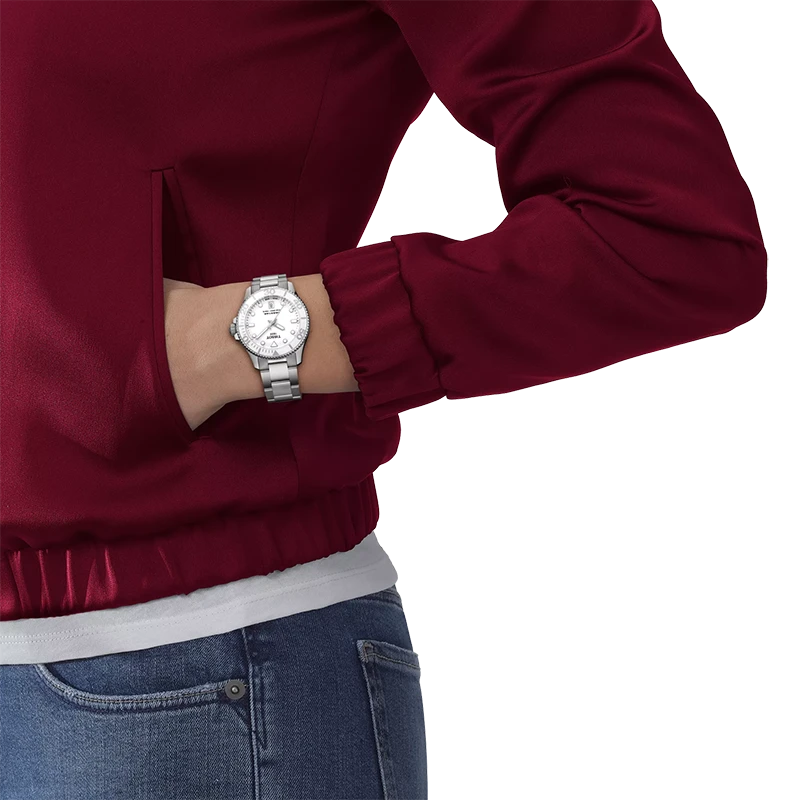 Den vita lackerade urtavlan ger klockan ett friskt och exklusivt uttryck som kontrasterar vackert mot boetten i 316L rostfritt stål. De tydliga indexen och visarna skapar utmärkt läsbarhet, skyddade av reptåligt safirglas med dubbel antireflexbehandling. Med sin 36 mm-boett erbjuder Seastar 1000 hög bärkomfort och ett balanserat intryck, perfekt för dig som föredrar en något mindre sportklocka. Stållänken är utrustad med snabbt bytessystem, vilket gör det enkelt att variera stilen.